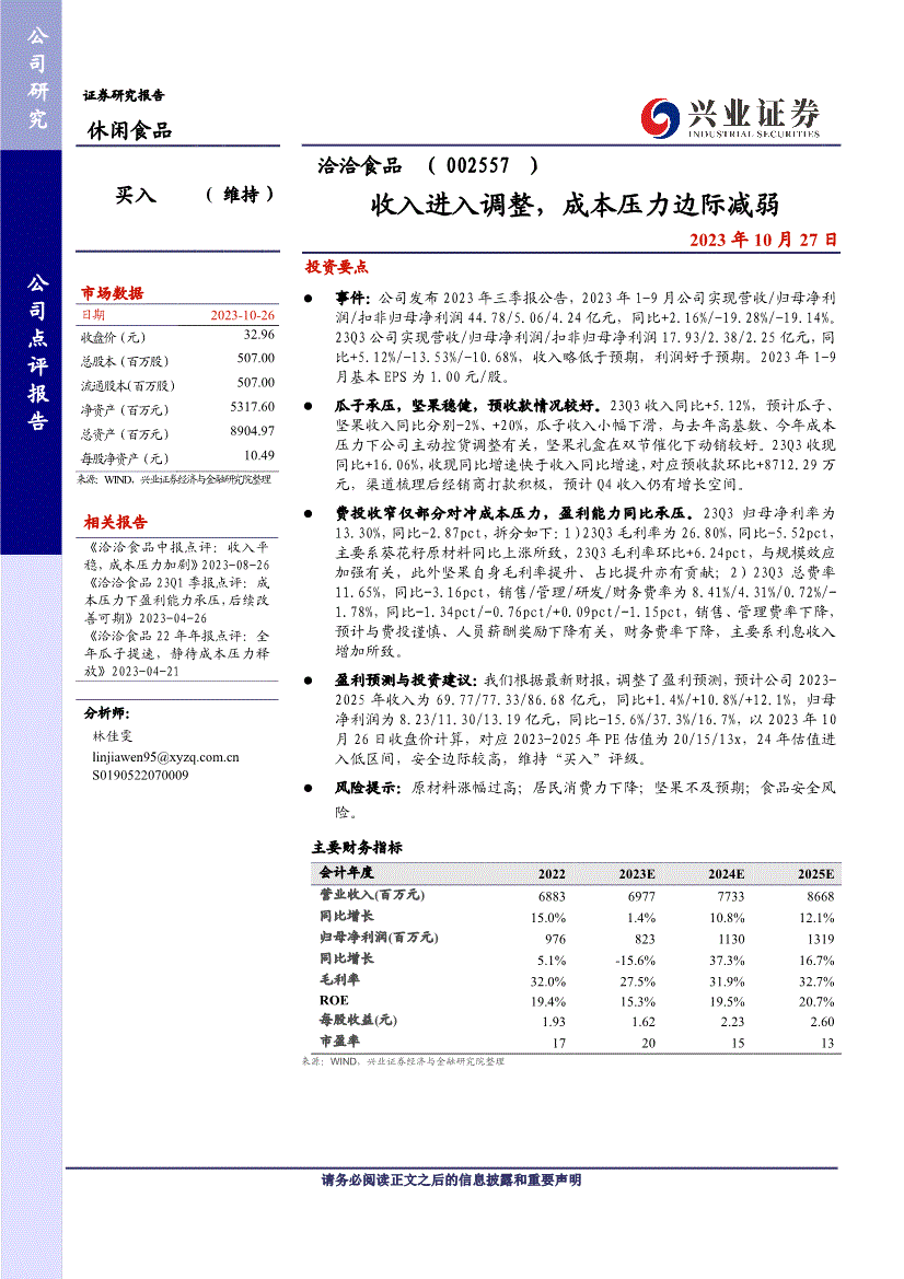 公司研究公司点评演讲证券研究演讲休闲食物买入( 维持) 市场数据日期2023-10-26 收盘价(元) 32。96 总股本(百万股) 507。00 畅通股本(百万股) 507。00 净资产(百万元) 5317。60 总资产(百万元) 8904。97 每股净资产(元) 10。49 来历:WIND,兴业证券经济取金融研究院拾掇 相关演讲《洽洽食物中报点评:收入平稳,成本压力加剧》2023-08-26 《洽洽食物23Q1季报点评:成本压力下盈利能力承压,后续改善可期》2023-04-26 《洽洽食物22年年报点评:全年瓜子提速,静待成本压力》2023-04-21 阐发师:林佳雯S09 投资要点 事务:公司发布2023年三季报通知布告,2023年1-9月公司实现营收/归母净利润/扣非归母净利润44。78/5。06/4。24亿元,同比+2。16%/-19。28%/-19。14%。23Q3收入同比+5。12%,估计瓜子、坚果收入同比别离-2%、+20%,瓜子收入小幅下滑,取客岁高基数、本年成本压力下公司自动控货调整相关,坚果礼盒正在双节催化下动销较好。23Q3收现同比+16。06%,收现同比增速快于收入同比增速,对应预收款环比+8712。29万元,渠道梳理后经销商打款积极,估计Q4收入仍有增加空间。23Q3归母净利率为13。30%,同比-2。87pct,拆分如下:1)23Q3毛利率为26。80%,同比-5。52pct,次要系葵花籽原材料同比上涨所致,23Q3毛利率环比+6。24pct,取规模效应加强相关,此外坚果本身毛利率提拔、占比提拔亦有贡献;2)23Q3总费率11。65%,同比-3。16pct,发卖/办理/研发/财政费率为8。41%/4。31%/0。72%/-1。78%,同比-1。34pct/-0。76pct/+0。09pct/-1。15pct,发卖、办理费率下降,估计取费投隆重、人员薪酬励下降相关,财政费率下降,次要系利钱收入添加所致。23Q3收入同比+5。12%,估计瓜子、坚果收入同比别离-2%、+20%,瓜子收入小幅下滑,取客岁高基数、本年成本压力下公司自动控货调整相关,坚果礼盒正在双节催化下动销较好。23Q3收现同比+16。06%,收现同比增速快于收入同比增速,对应预收款环比+8712。29万元,渠道梳理后经销商打款积极,估计Q4收入仍有增加空间。23Q3归母净利率为13。30%,同比-2。87pct,同比-5。52pct,次要系葵花籽原材料同比上涨所致,23Q3毛利率环比+6。24pct,取规模效应加强相关,此外坚果本身毛利率提拔、占比提拔亦有贡献;2)23Q3总费率11。65%,同比-3。16pct,发卖/办理/研发/财政费率为8。41%/4。31%/0。72%/-1。78%,同比-1。34pct/-0。76pct/+0。09pct/-1。15pct,办理费率下降,估计取费投隆重、人员薪酬励下降相关,财政费率下降,次要系利钱收入添加所致。投资评级申明投资的评级尺度类别评级说告中投资所涉及的评级分为股票评级和行业评级(还有申明的除外)。评级尺度为报布日后的12个月内公司股价(或行业指数)相对同期相关证券市场代表性指数的涨跌幅。此中:沪深两市以沪深300指数为基准;北交所市场以北证50指数为基准;新三板市场以三板成指为基准;市场以恒生指数为基准;美国市场以标普500或纳斯达克分析指数为基准。股票评级买入相对同期相关证券市场代表性指数涨幅大于15% 增持相对同期相关证券市场代表性指数涨幅正在5%~15%之间中性相对同期相关证券市场代表性指数涨幅正在-5%~5%之间减持相对同期相关证券市场代表性指数涨幅小于-5% 无评级因为我们无法获取需要的材料,或者公司面对无法预见成果的严沉不确定性事务,或者其他缘由,以致我们无法给出明白的投资评级行业评级保举相对表示优于同期相关证券市场代表性指数中性相对表示取同期相关证券市场代表性指数持平回避相对表示弱于同期相关证券市场代表性指数消息披露本公司正在晓得的范畴内履行消息披露权利。利用本研究演讲的风险提醒及法令声明兴业证券股份无限公司经中国证券监视办理委员会核准,已具备证券投资征询营业资历。本演讲中的消息、看法等均仅供客户参考,不形成所述证券买卖的出价或征价邀请或要约,投资者自从做出投资决策并自行承担投资风险,任何形式的分享证券投资收益或者分管证券投资丧失的书面或口头许诺均为无效,任何相关本演讲的摘要或节选都不代表本演讲正式完整的概念,一切须以本公司向客户发布的本演讲完整版本为准。该等消息、看法并未考虑到获取本演讲人员的具体投资目标、财政情况以及特定需求,正在任何时候均不形成对任何人的小我保举。客户该当对本演讲中的消息和看法进行评估,并应同时考量各自的投资目标、财政情况和特定需求,需要时就法令、贸易、财政、税收等方面征询专家的看法。本演讲所载材料的来历被认为是靠得住的,但本公司不其精确性或完整性,也不所包含的消息和不会发生任何变动。本公司并不合错误利用本演讲所包含的材料发生的任何间接或间接丧失或取此相关的其他任何丧失承担任何义务。本演讲所载的材料、看法及猜测仅反映本公司于发布本演讲当日的判断,价值及投资收入可升可跌,过往表示不该做为日后的表示根据;正在分歧期间,本公司可发出取本演讲所载材料、看法及猜测不分歧的演讲;本公司不本演讲所含消息连结正在最新形态。同时,本公司对本演讲所含消息可正在不发出通知的景象下做出点窜,投资者该当自行关心响应的更新或点窜。本公司的发卖人员、买卖人员以及其他专业人士可能会根据分歧假设和尺度、采用分歧的阐发方式而口头或书面颁发取本演讲看法及不分歧的市场评论和/或买卖概念。本公司的资产办理部分、自营部分以及其他投资营业部分可
