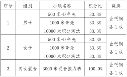 速度轮滑设须眉集体积分赛(500米+D抢先、1000米抢先、10000米积分裁减)、速度轮滑女子集体积分赛(500米+D抢先、1000米抢先、10000米积分裁减)、速度轮滑3000米男女夹杂接力赛三个小项。施行中国轮滑协会最新核定的《速度轮滑竞赛法则取裁判公例》及世界轮滑结合会最新修订条目。速度轮滑须眉集体积分赛、速度轮滑女子集体积分赛排名法子按各小项名次积分之和排序,各小项第1-8名别离按9、7、6、5、4、3、2、如集体积分相等,冠军多者列前,冠军数相等,亚军多者列前,以此类推。3000米男女夹杂接力赛,各单元可报4名活动员(含1名替补),参赛的3名活动员不得单一性别,且每人至多完成3次接力。