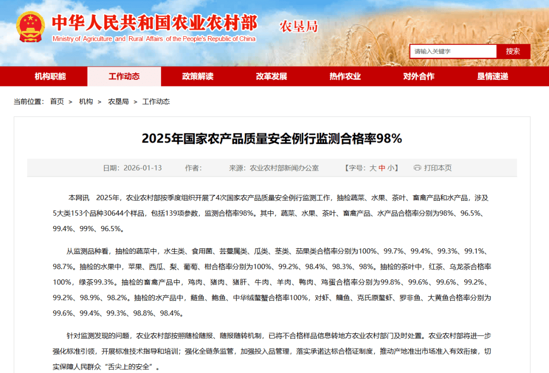1月13日,农业农村部旧事办公室发布2025年国度农产质量量平安例行监测及格率,茶叶及格率达到99。4%。